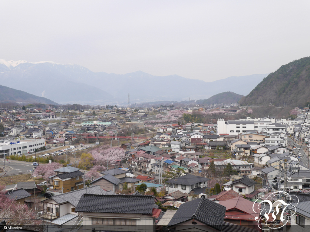 | 放眼望去盡是盛開的小彼岸櫻,遠方可見南阿爾卑斯山脈 |